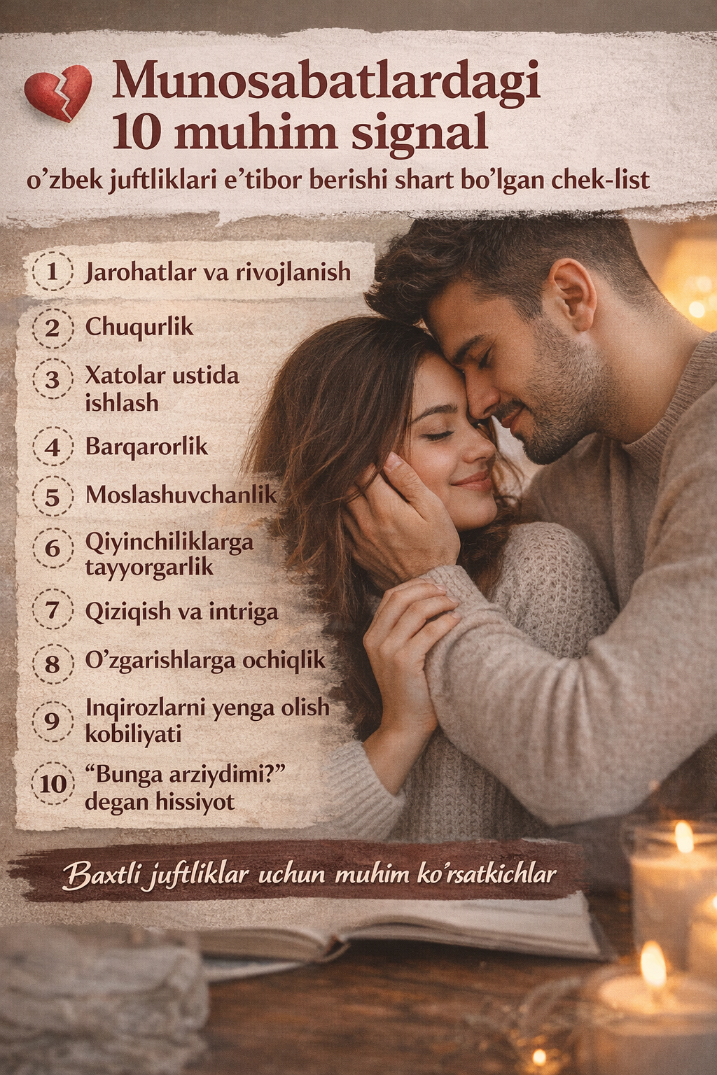 Munosabatlar o‘z-o‘zidan mustahkam bo‘lib qolmaydi. Ayniqsa, o‘zbek jamiyatida oila qadri baland ekan, bu chek-listni vaqti-vaqti bilan ko‘rib chiqish — ongli va sog‘lom munosabat sari muhim qadamdir.